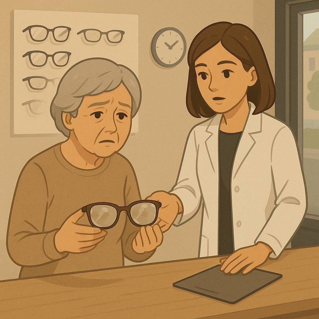 Pani Marzena weszła do salonu optycznego na Królewskiej, trzymając w dłoniach swoje okulary progresywne. Na jej twarzy malowało się zmartwienie.
